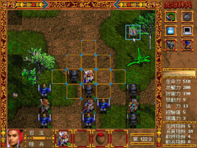 当将鼠标移至武将时,武将周围会出现黄框,这表示武将的领导范围。与此同时,与这个武将一队的士兵也会挥动武器。如果士兵是在同队武将的领导范围内攻击敌人,则攻击效果便会加倍。单击武将後,没有阴影的地形表示是在移动范围之内。