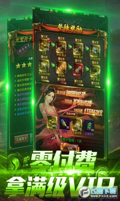 单日累积充值10000元:1个至尊神剑、1个至尊神甲、20个至尊转生丹、20个战灵装备箱(6阶)、300个中级玉佩碎片