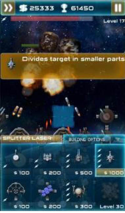 一款玩法富有创意的太空塔防类游戏,故事发生在地球的近地轨道。地球遇到太空中的小行星的袭击,你需要在外太空建立一个防御空间站,搭建各种武器装备,同时空间站需要建造能量中心提供电力,不然武器武器将无法使用。