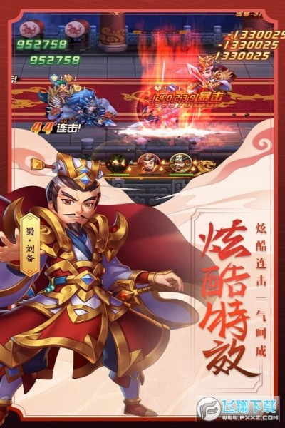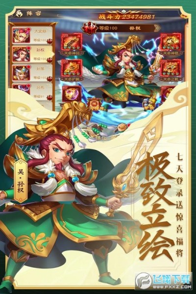 近百位三国名将齐聚,大展身手各显神通!武将采用二头身Q版风格,并参照名著《三国志》进行设计。虽然是Q萌设计,但是辨识度十分高,每位武将都有鲜明的特点。还有独特的技能体系,普通攻击、主动技能、自动技能,技能特效华丽炫酷,光影效果十足。技能多不重样,给玩家带来极致的视听享受。