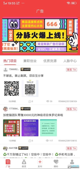 分脉APP非常适合推广项目的朋友使用,是很多首码项目的发放中心,不管是营销还是创业都可以在上面寻求帮助,最关键的是每天可以免费发布一条广告,简直不要太好!