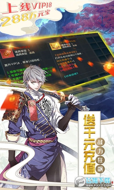 1.上线即满V(VIP18),288万元宝,2888万铜币,千元充值卡!