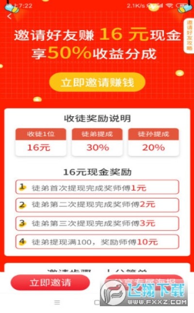 1、每邀请一个好友可获得29元,另外收徒还能获得两级共计50%的进贡收益