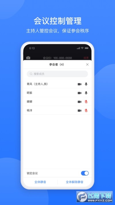 3. 主持人会管会控:主持人一键全体静音、移除参会者、锁定会议等,极力保证会议秩序