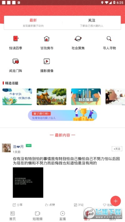 3、软件拥有新闻资讯,短视频,直播,圈子等等诸多功能内容,可以帮助更好的引导及服务九龙县。