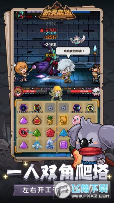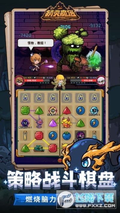爬塔之路并不轻松,开动脑筋,策略组合多方资源能让你走得更远。战斗棋盘花样多多,合成不同颜色的宝石,为兄妹两人输送各类增益Buff。通过战斗成功解救可爱精灵,连线组合多重精灵阵型,为你提供强力助攻。
