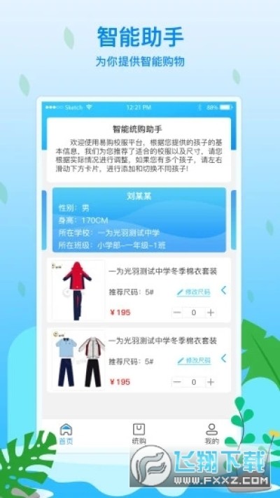 一 . 家长注册APP注册后,添加自己孩子,系统自动推荐对应的款 式尺码及数量。让家长一键下单,轻松完成统购。