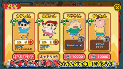 游戏采用横版跑酷风格,配合丰富的道具与障碍,很有挑战性,很有意思。游戏音乐很欢乐,和原著蜡笔小新很是契合。