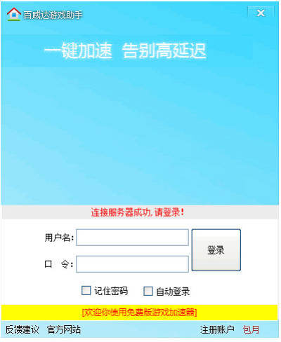 百威达游戏加速助手是一款功能非常强大的游戏加速器工具,该软件采用光钎骨干网络代理net数据周转,降低延迟,完美支持所有游戏,付费与免费使用,自由选择,完美支持win2000,winxp win8 系统,采用pptp l2tp 协议通道连接,提供加速服务,一键自动测试ip并加速,无需过多设置!程序特适合广东省长城宽带使用。