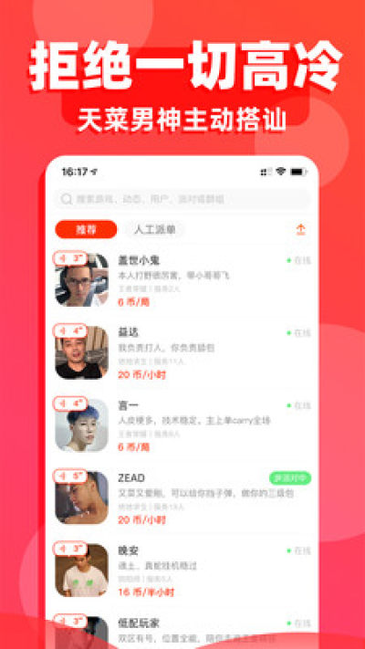 · 人工派单聊天室:接待与老板实时在线互动,为你选出心仪男神。
