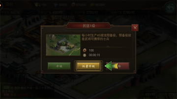 同时我们也需要升级自己的太守府,因为太守府的等级是提高其他建筑等级的标杆。太守府的升级是需要金币的,而且需要一定的时间,等级越高需要的时间越多,不过可以使用加速道具来减少升级时间。