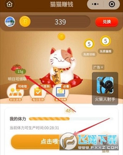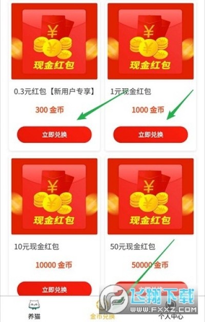 猫猫赚钱新人首次提现0.3起,我们赚够300金币后就可以去兑换提现。先领取猫粮然后喂猫,过几个小时回来兑换。