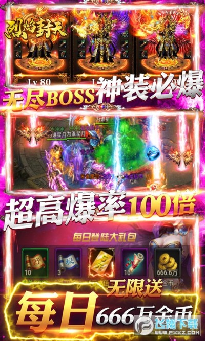 《烈焰封天》是一款独创1秒百级,刀刀斩杀,创号三角色,真百倍爆率的全新传奇类手游。最强开局福利,每日送真充,极致激爽体验1秒百级,1元超低月卡,海量元宝返利,档档超劲爆福利,赢在起跑线!打不尽的BOSS,爆不停的元宝,千人同屏攻沙,跨服自由PK,最激爽传奇,邀你来战!