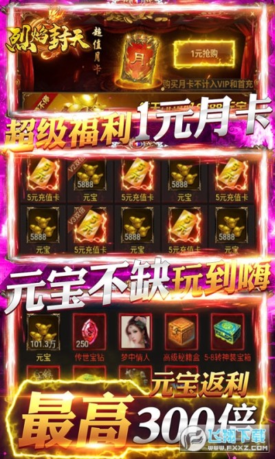 《烈焰封天每日无限送充值卡》是一款经典的传奇手游,熟悉的三大职业角色,酷炫的技能效果,和小伙伴一起战斗挑战BOSS,游戏上线即送满级VIP和超多元宝,每天登录送真充,1元解锁月卡,升级速度飞快,无限十连抽,助你迅速提升战力,赶快下载体验吧!