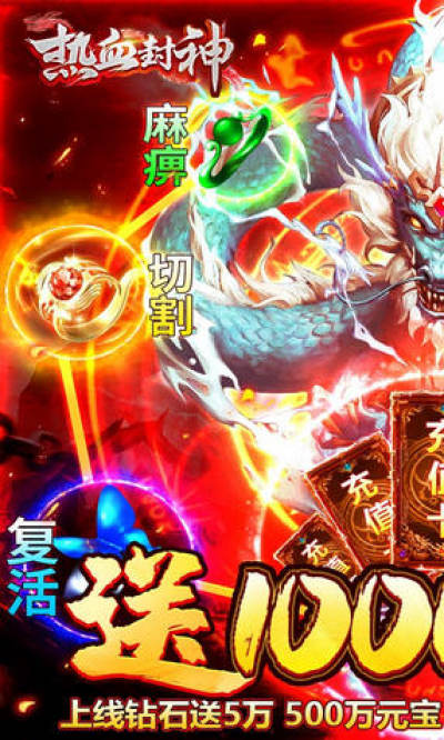 热血封神上线送5万钻石版是一款仙侠题材角色扮演手游,上线就送1000元充值和5万钻石,更有满级vip可以领取!超搞爆率打怪就爆充值红包!更多精彩玩法等你来发现哦!快来下载吧!