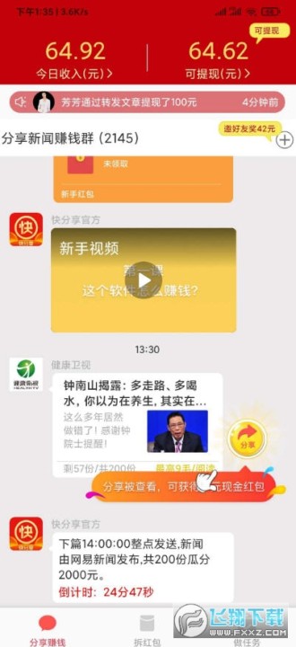 快分享是看广告拆红包的平台,新用户登录领红包,可直接提现0.3元,秒到微信零钱!