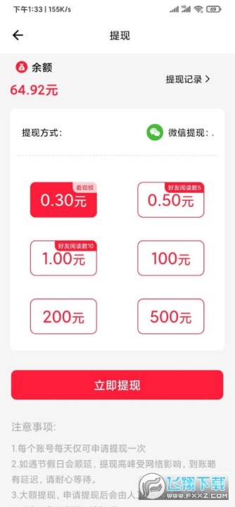 3、收益满0.3元、2元、5元都能提现,可选择提现到微信或支付宝上,超低门槛,提现一般秒到,最晚24小时到账