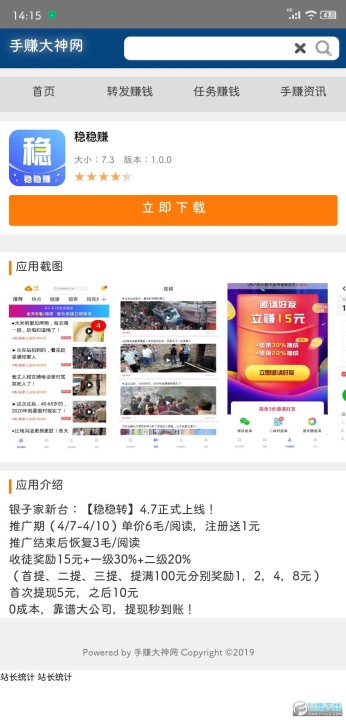 手赚大神网APP是一家网络兼职网站,主要提供手机赚钱、试玩赚钱、任务赚钱、网络兼职赚钱等项目!为想兼职的用户打造安全,可靠,的赚钱之旅!长期及时更新最新赚钱软件,而且每天都会更新网上赚钱推广方法和网赚技术分享!