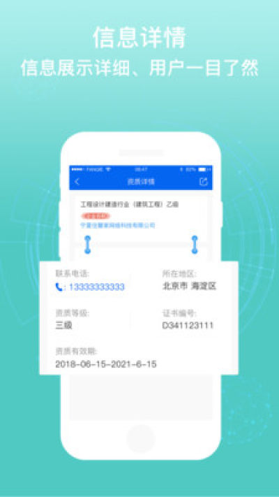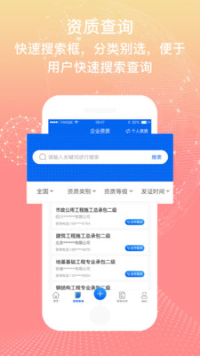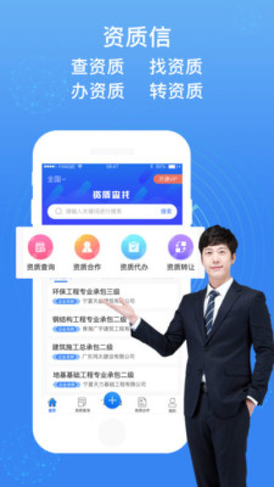 资质信App是一款专业的资质合作、资质查询、资质代办及资质转让平台,汇聚了海量个人资质、企业资质、及资质代办机构、资质转让等服务,涵盖全行业资质服务,为资质拥有者及代办服务机构、寻求资质合作者提供精准的沟通桥梁。