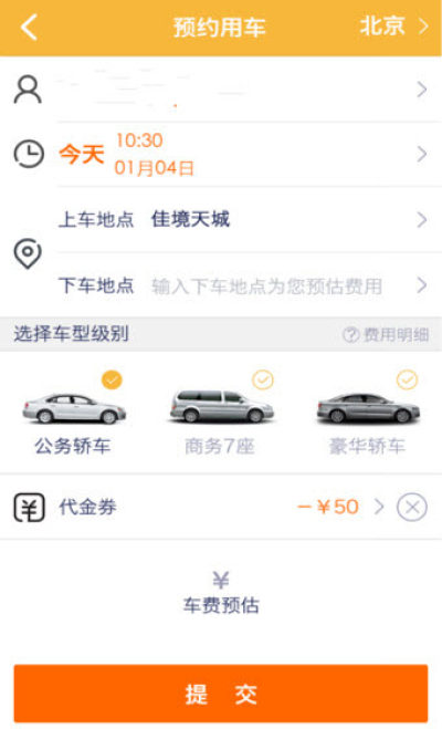 1.服务类型:随叫随到、预约用车、接/送机、日租/半日租