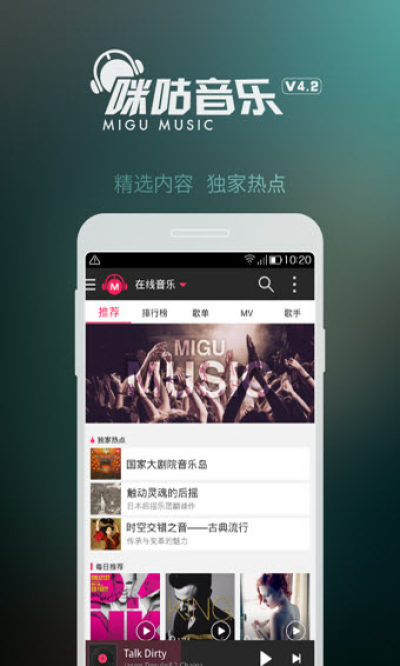 这是咪咕音乐的手机客户端,专为安卓手机用户特别定制,这款咪咕音乐为大家准备了大量好听的原创歌曲,音乐资源非常丰富,且播放音质俱佳,是所有音乐爱好者的最佳选择!