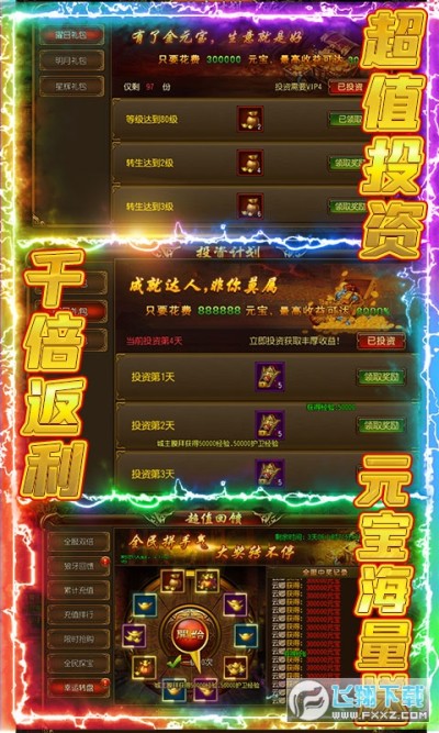 3、最强福利:充值比例1:10000,首充5倍返利、极品装备套装、海量资源任意送!