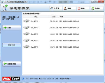 步骤一:首先从Windows电脑中打开MiniTool数据恢复工具,会来到软件的操作主界面,如果U盘中的文件都是因为误删除而导致丢失的话,就可以选择“误删除恢复”模块,点击了“误删除恢复”就可以进入设备列表界面。这时根据容量等信息选择U盘设备,然后点击“扫描”按钮对U盘进行扫描。