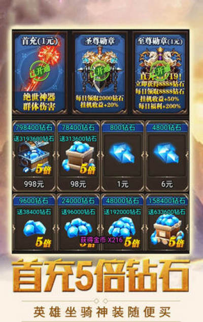 2、充值比例1:800,首充还有5倍钻石奖励!还有各种豪华奖励,一个字送!