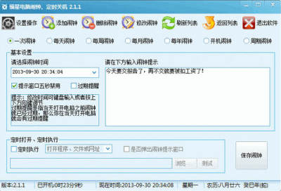 福星电脑闹钟是一款非常强大的具有定时闹钟提醒、定时关机、定时打开关闭程序、定时打开禁用网络、定时锁定电脑等多种功能的电脑定时闹钟工具,还可以设置鼠标键盘无操作时自动待机休眠、关机、锁定、关闭电脑等。