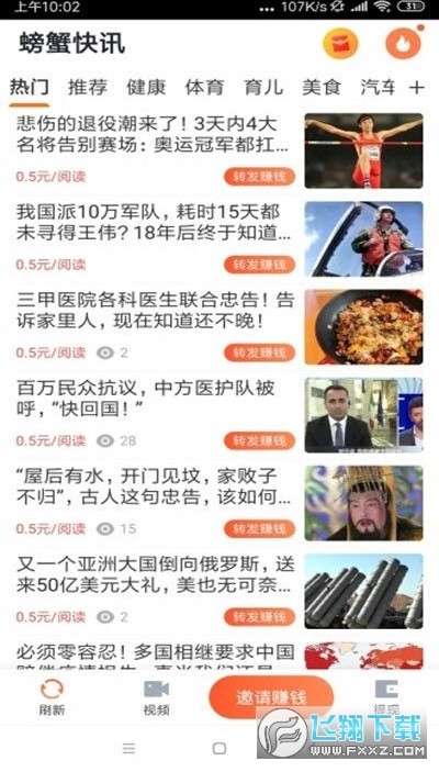 螃蟹资讯转发赚钱app是一个新上线的资讯转发转发平台,用户下载安装螃蟹资讯后,点一下APP左下方的"转发文章赚钱"标志开启文章列表,不管是看文章,或是看视频,对于大家来说都是一种非常便捷的赚钱方式,有兴趣的小伙伴快来下载吧。