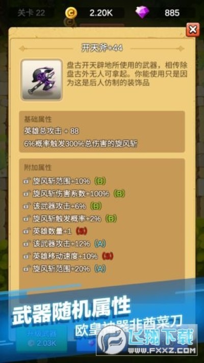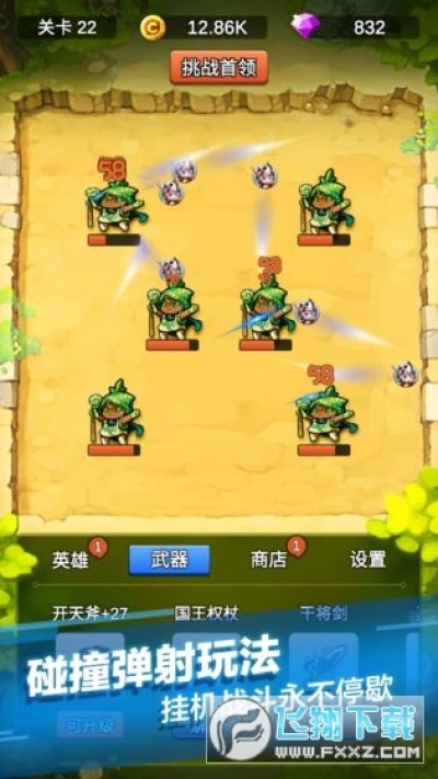 1、放置玩法轻松简单,点击购买英雄发生让英雄在关卡中无限弹射攻击怪物。