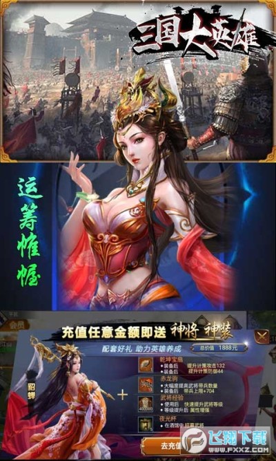 《三国大英雄-无限送充值》首创竞技策略手游,百城无缝大地图,真实展现了三国时期的整体图景。 内政+军事+计策,带来最正统的三国志玩法。 游戏中,您穿越至三国时期,扮演一方诸侯,招兵买马,发展内政、扩张势力,最终吞并天下。 权利的游戏没有剧本,是三国鼎立还是七雄争霸亦或十八路诸侯势均力敌,这里发生的一切都与你的努力息息相关!