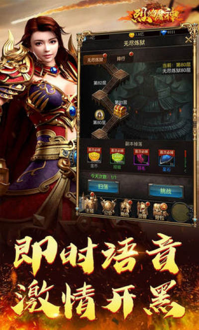 《烈焰屠神》震撼来袭!继承了传奇的核心玩法,延续了传奇的经典设定,原汁原味的还原经典,且新增圣兽宫等全新圣兽副本,打BOSS得元宝!本作画质全面升级,顶级蓝光场景,超爽的战斗体验!让我们再燃传奇经典,再现一代人的青春,再次感受兄弟之间的热血情谊!