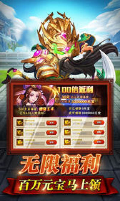 4、日常、签到奖励大幅度提升,在线60分钟即送3W元宝,超强基金百倍返利,总计300W元宝;