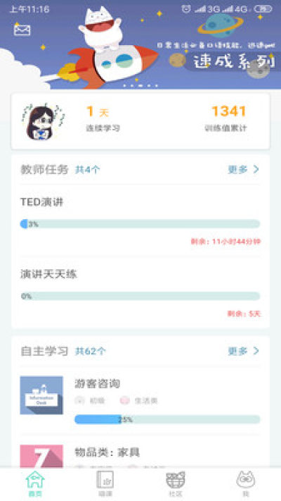 内容涵盖了四六级、旅游出行、校园生活、海外生活、职场口语等各类场景和语音训练、词汇训练、语法训练等基础技能教程。