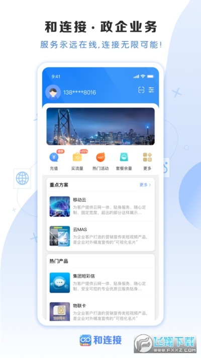 和连接app是云南移动推出的官方移动客户端,主要是提供线上业务办理服务,全天候24小时为大家服务,用户可以随时随地查询自己的话费、流量等使用情况,有问题也可以线上办理解决,有需要就下载和连接app体验吧。