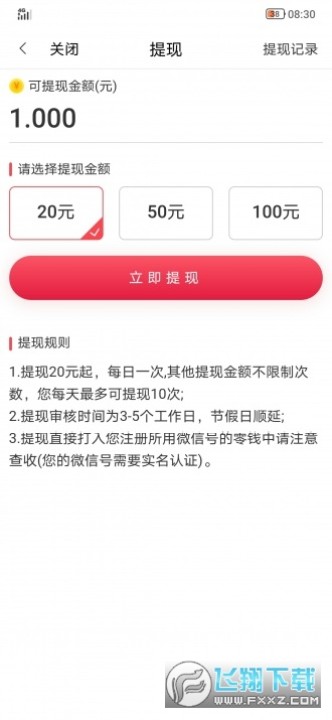 1.提现20元起,每日一次,其他提现金额不限制次数,您每天最多可提现10次;