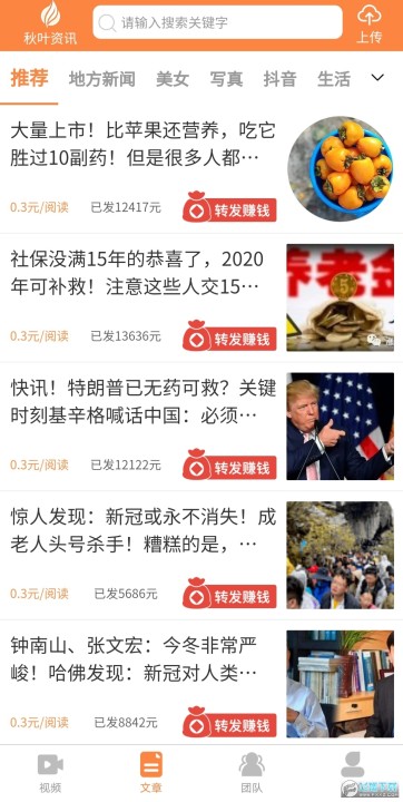 秋叶资讯是一款转发文章就能赚到现金的手机软件,零投入就可以让每一个用户赚钱!文章单价0.3元,5元随时提现秒到账,喜欢的用户可下载体验赚钱吧。