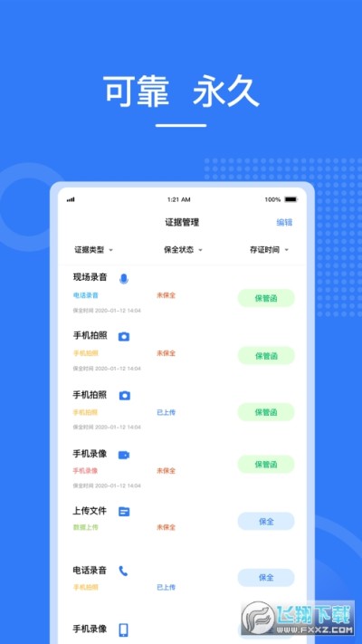 将保存在手机中的电子数据通过本软件上传至本处数据存证平台,由本处数据存证平台对上传时间和上传后的电子数据副本真实性加以固定。