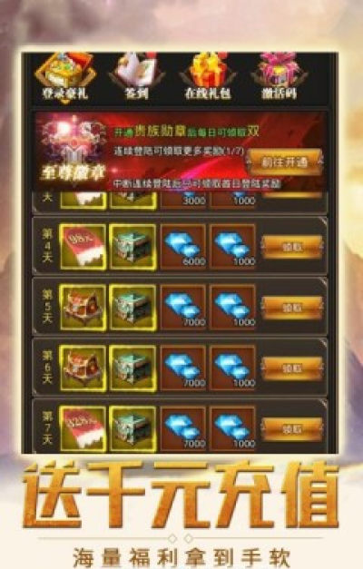 1、上线既送vip1868888钻石,金币888W!还有千元充值领取,充值1元购买至尊徽章还能再次领取!什么叫爽!这就叫爽!