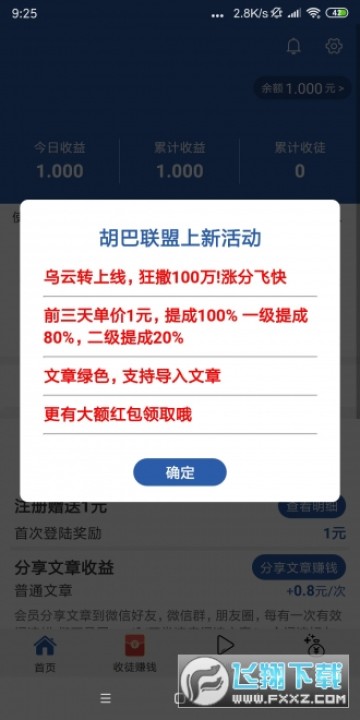 新人下载乌云转填写邀请码就送1元,转发文章单价全天1元/次,点击秒上量