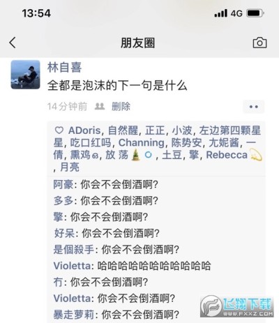 全都是泡沫的下一句是什么?很多人应该会忍不住唱出来吧,但是网友们的梗总是层出不穷的,很多小伙伴在发布了相应的朋友圈状态之后,下面的评论全部都是你会不会倒酒啊,这也成为了一个新的梗,喜欢的小伙伴现在就可以轻松下载到本地拥有哦。