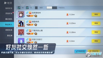 好友界面,界面升级!整体优化了界面表现,使好友界面更加简约实用。新增了添加好友的验证消息!漫游者们可以自定义专属于你的交友宣言。别犹豫啦!快来结交更多朋友吧,一起上车,一起玩!