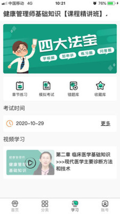 2、视频学习、章节练习、模拟考试、重点串讲、错题本
