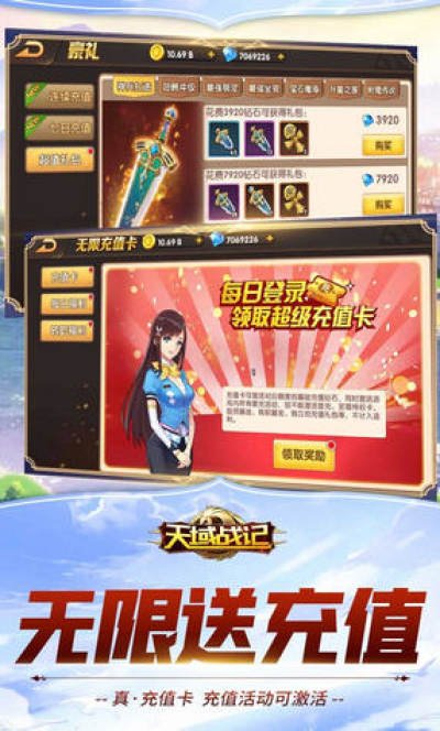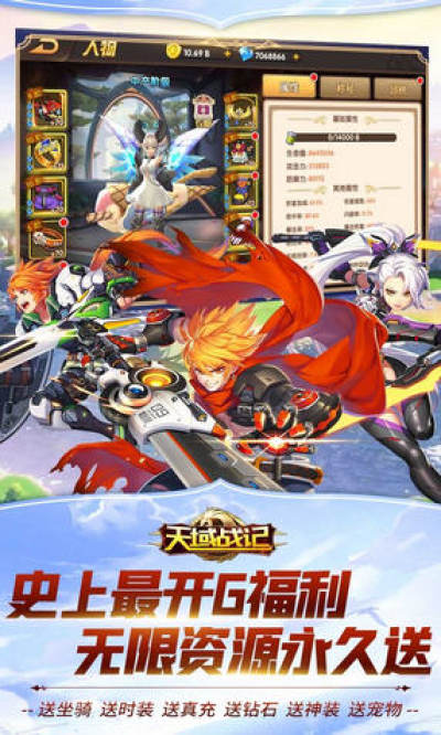 天域战记送免费神装是一款精心打造的超变态福利Q版ARPG手游大作!(无限充值卡每日福利领取至尊抽奖卷和金币,转职福利领取千元充值卡和金色神装) 上线送满V、传说级坐骑-嘻哈鸡,永久每日送至尊抽奖券、无限金币,永久每日送充值卡,无限福利领不停! 高度还原热门动漫人物,多样化的职业分支、无限连击的动作特性、精准的操作体验与打击快感,杀戮之塔、世界BOSS、荣耀战场、古墓密藏等特色玩法,带你进入精彩纷呈的冒险之旅。
