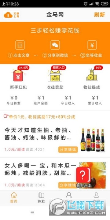 金马网零花钱APP是由金蟾网旗下推出的转发文章赚钱软件平台,类似金马网APP的还有金豹网、金凤网、金蝶网等等。金马网零花钱APP下载安装就有新人奖励,并且完成一定的任务要求,最高可获得34.5元的现金奖励,平台上每天更新上千篇优质好文,转发分享至微信群或朋友圈,好友成功阅读就能赚钱,感兴趣的用户赶紧下载金马网,增加自己的收入吧!