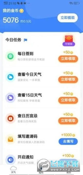 这个好运天气软件,连续签到5天还可以提现1元,后面还有20元的新人专享提现体验,主要是金币的积累了。金币的积累靠做任务赚取到,例如:福利栏目里的签到任务、今日任务,好运栏目里的刮幸运卡任务,首页的天气气泡奖励领取等。