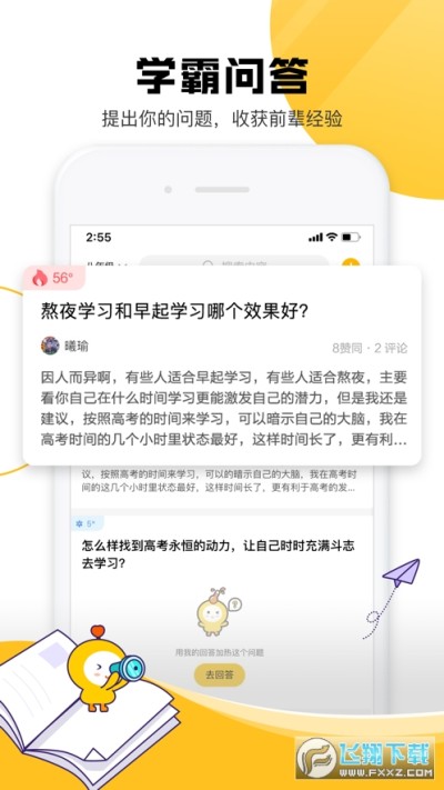 - 学霸问答:面向优秀的学霸,关于学习方法、考试技巧、生活习惯等等,可以直接提问哦!他们会在第一时间回复你的问题,当然优秀如你,也可以去分享自己的经验,回复其他同学的问题~
