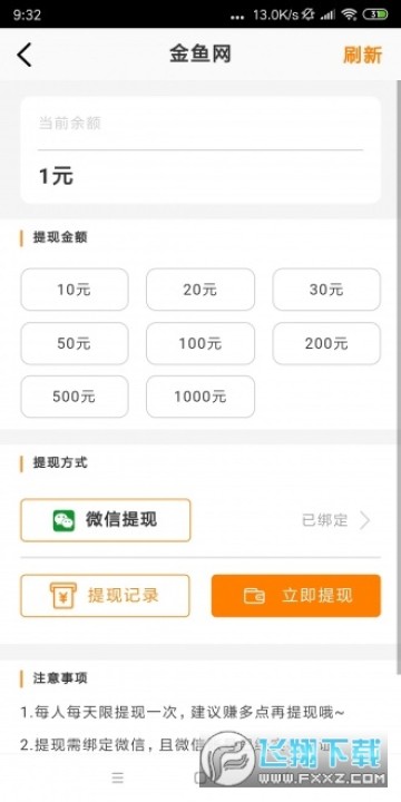 金鱼网收益永久满10元可申请提现