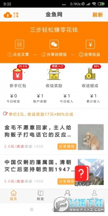 金鱼网零花钱转发赚钱app靠谱吗?金鱼网靠什么赚钱发给大家?金鱼网app是来自大平台金蟾网旗下刚刚推出的全新转发平台,注册就送2元现金奖励,转发单价更是全天候1元一次,不用在特定时间等待哦,随时都可以转发文章赚钱。